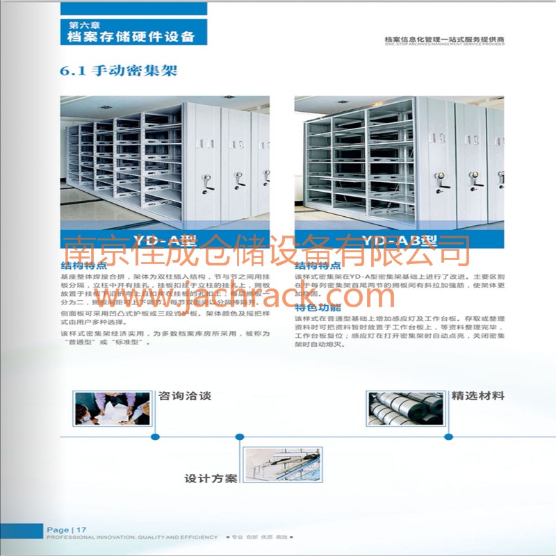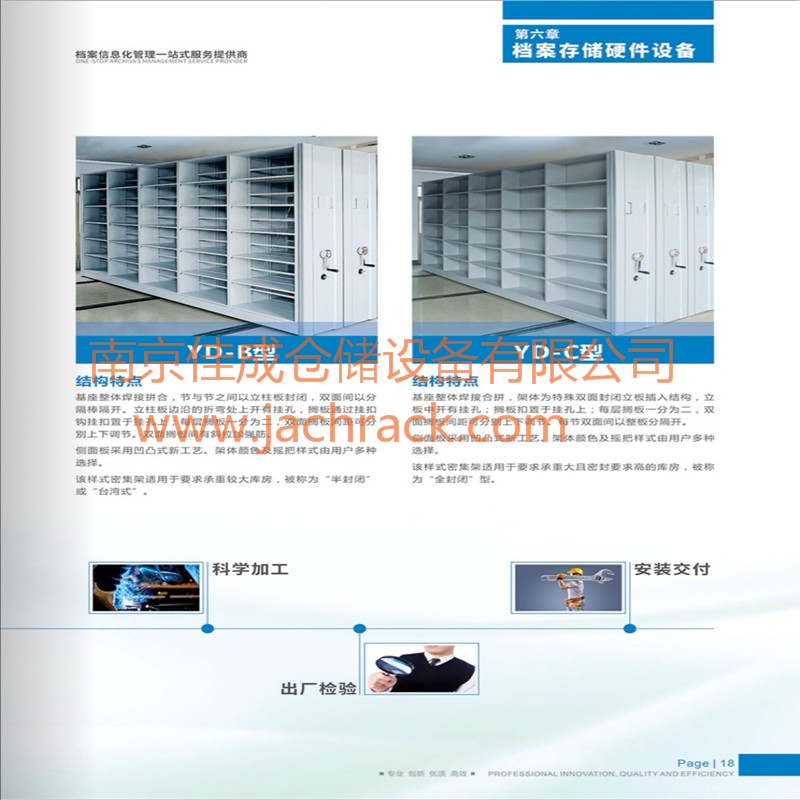 产品采用优质冷轧钢板模压成型,表面经去油--除锈--表调--磷化--清洗--钝化等十道工序加工而成。国际新流行色亚光静电喷粉,高温塑化而成,防锈蚀性能卓越,颜色由用户多种选择。架体之间的接触面配有缓冲,磁性密封条,顶部有防尘板,底部有防鼠装置。每列架体设有安全限位制动装置及防倾倒装置。边架装有锁具,用于整体锁闭。传动机构通过精加工处理,使用精密轴承,传动灵活平稳。层板间距根据需要可自由调节。