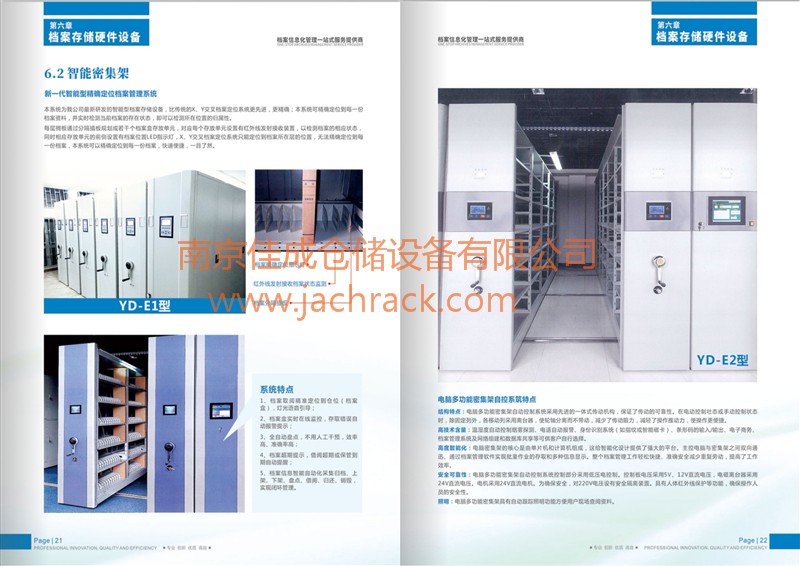 v活动式密集架是在传统档案架的基础上采用轨道把多个架列密集到一起,使档案在单位面积上的存贮量提高,节省面积可达50%以上,并有防火、防盗、防尘等优点。但这种档案架造价高,增加了建筑负荷,增加了库房建筑的投资,调用档案不如一般的档案架方便,如遇特殊情况,抢救档案比较困难。